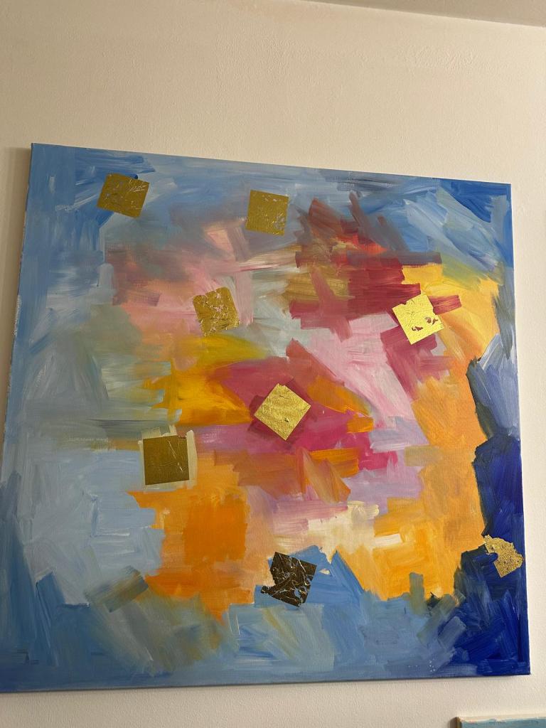 This work is an abstract map of a memory the exact moment the sun breaks through a light coastal mist. I used the gold foil to represent the sudden, brilliant sparks of light that dance on the Adriatic surface, almost like hidden treasures floating in the deep. It is a celebration of the ‘preciousness’ of our everyday surroundings, where the warmth of the land and the cooling spray of the sea collide in a vibrant, golden spray.