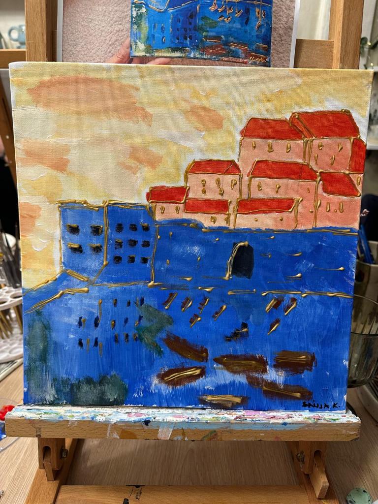 This painting represents the protective embrace of our coastal towns. The deep sapphire walls act as a bridge between the wild, unpredictable sea and the warm safety of our homes under their red-tiled roofs. I used gold outlines to show that even in the shadows of the harbor, there is a constant, precious thread of light guiding us back home. It is a portrait of the peace that settles over the harbor just as the boats find their moorings for the night.
